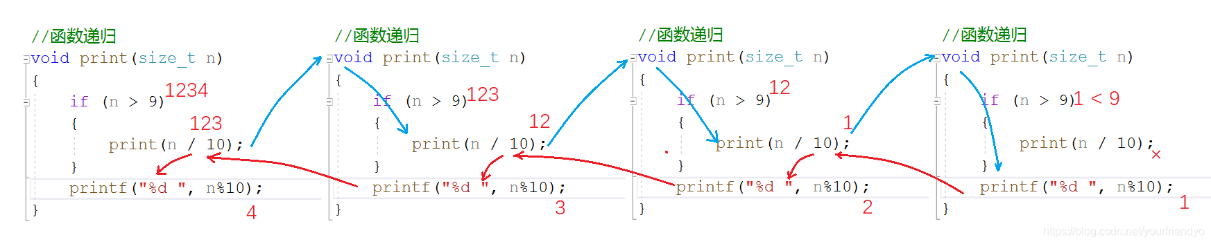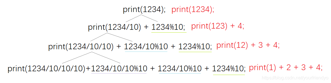 那我们创建一个函数叫print,若print(1234),则剥离一位变成print(123)+4,再剥离一位成print(12)+3+4,再来一位就是print(1)+2+3+4,最后只有一位了,那就全部用printf 函数打印。如: