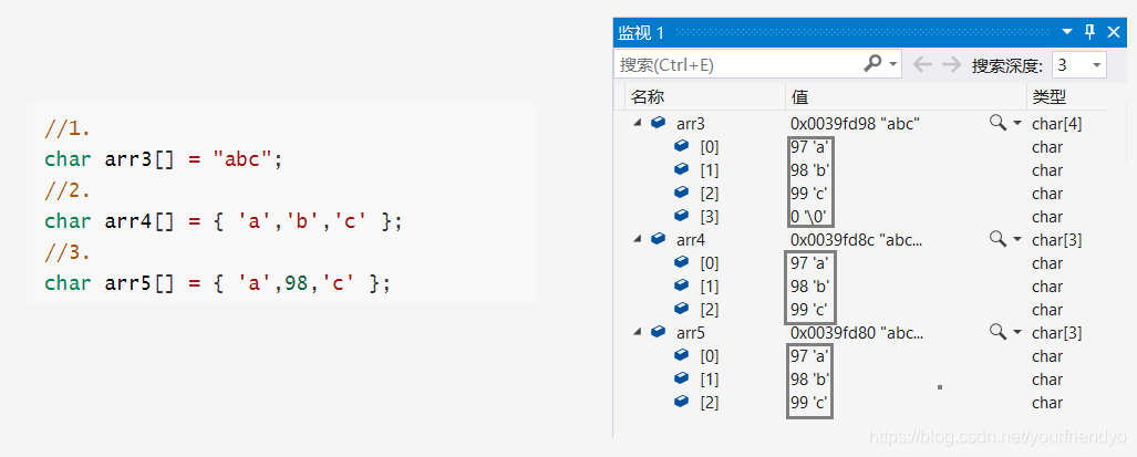 第二种和第三种是一样的,因为数组元素类型是字符型,且字符'b'的ACSII码值是98,自动将98解析为字符。a b c
