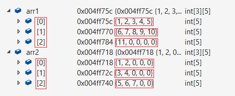int arr2[3][5] = { {1,2},{3,4},{5,6,7} };