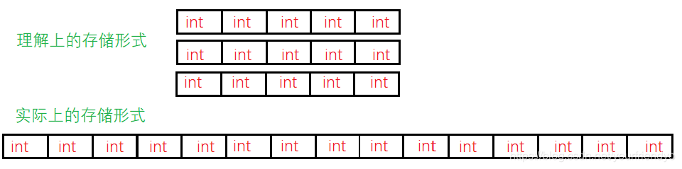 这样的话,二维数组在内存中的存储形式便是大家想象中的二维的形式,把每一行理解为一个一维数组,这样的话二维数组在内存中的存储形式还是一维的。如下图的对比: