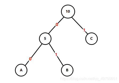 通过已经构造的哈夫曼树,结点左分支记为二进制数“0”,结点右分支记为二进制数“1”。从根结点向下到该叶子结点路途经过的数字拼接成为的编码即为该字符的哈夫曼编码。现通过以下图例进行演示。