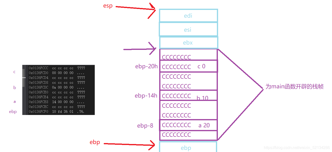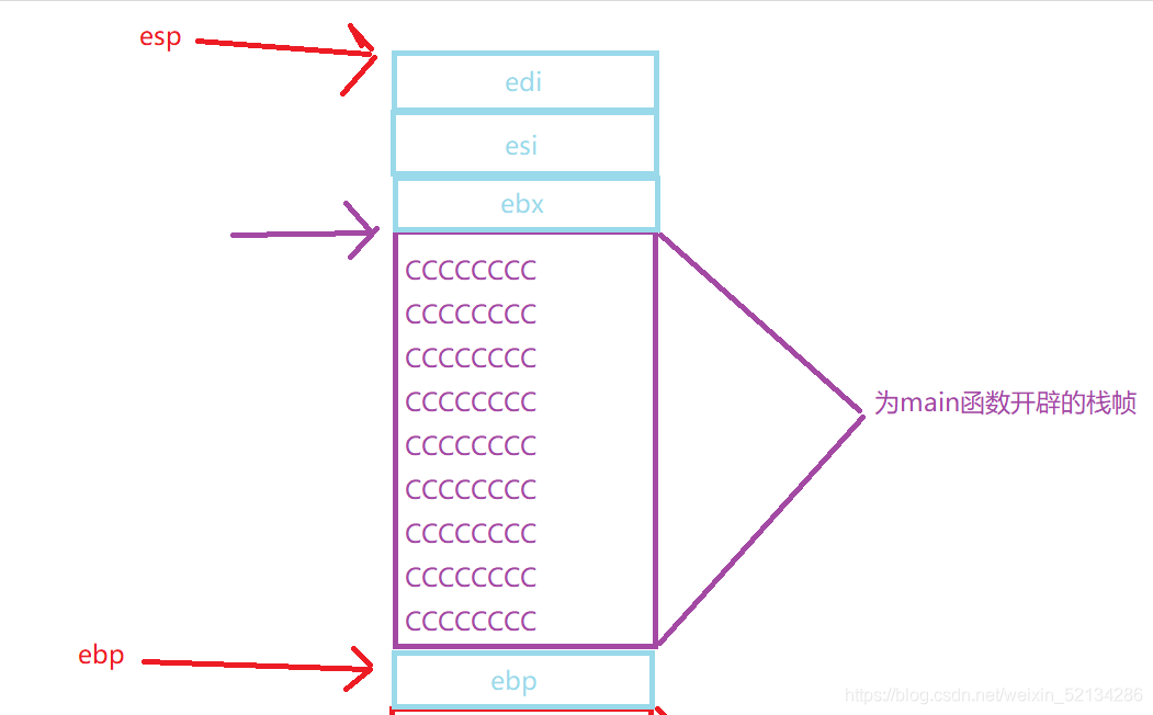当进入main函数前,esp,ebp在如下位置