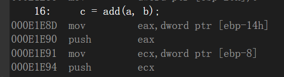 然后进入c = add(a,b)语句,首先将ebp-14h的值放到eax寄存器中在将eax的值进行压栈操作,再将ebp-8的值放到ecx寄存器中在将ecx的值进行压栈操作。