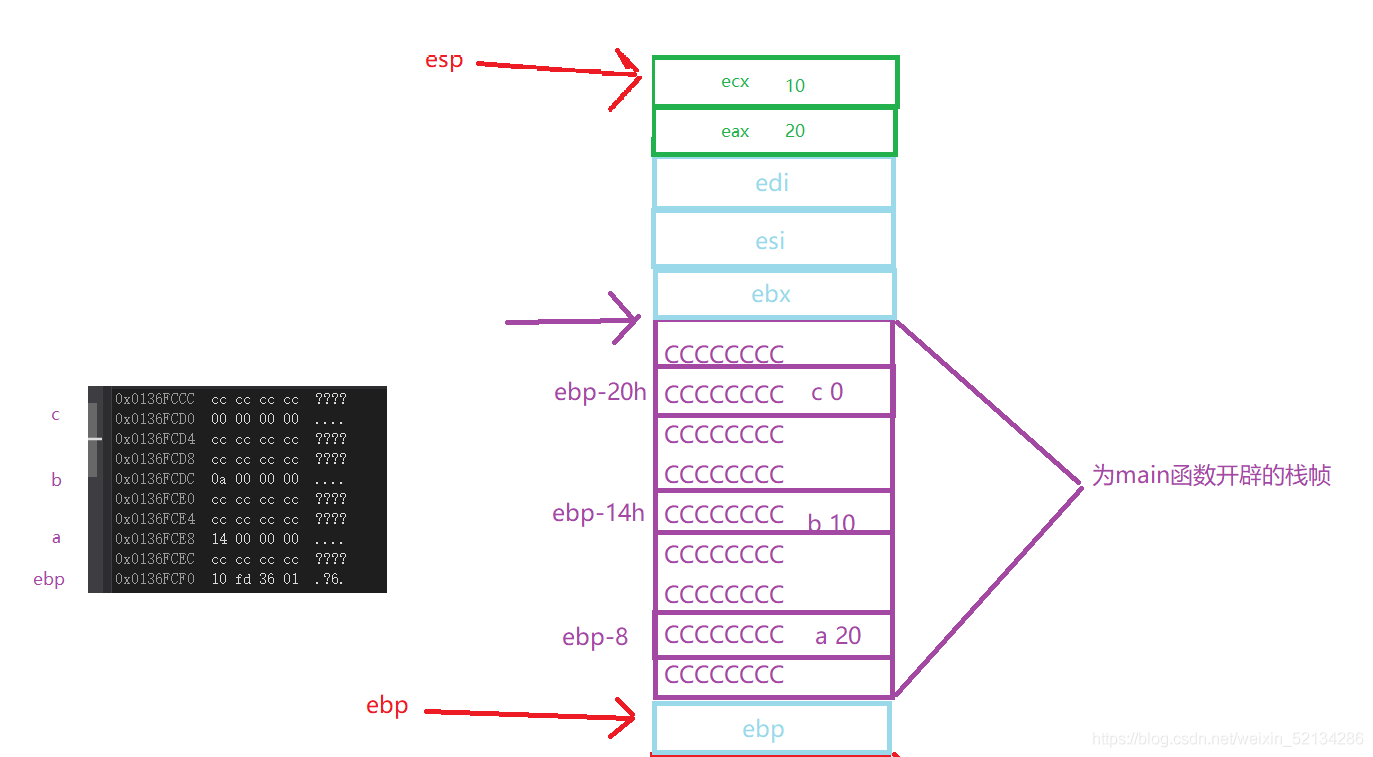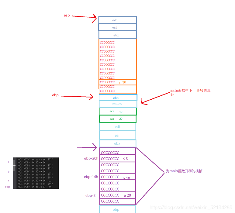 下面图片中绿色框里eax应该是10,ecx是20,画图时写反了实在是抱歉