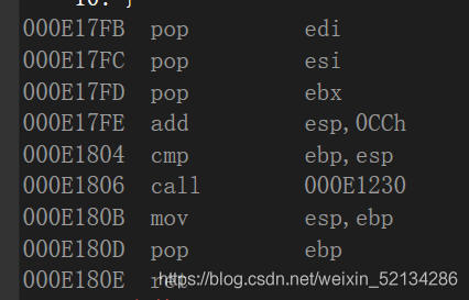 首先分别将edi,esi,ebx进行出栈,然后将esp加上0CCh也就是回到ebp的位置,然后将ebp的值赋给esp,再将ebp进行出栈操作(这样就能回到原来的main函数的ebp位置从而将add的栈帧空间还给操作系统)