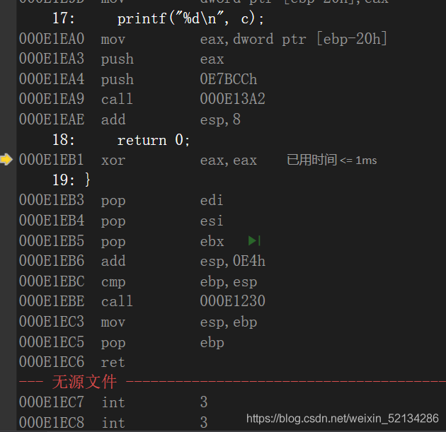000E17F2 add eax,dword ptr [ebp+0Ch] //将b+a的值赋给eax