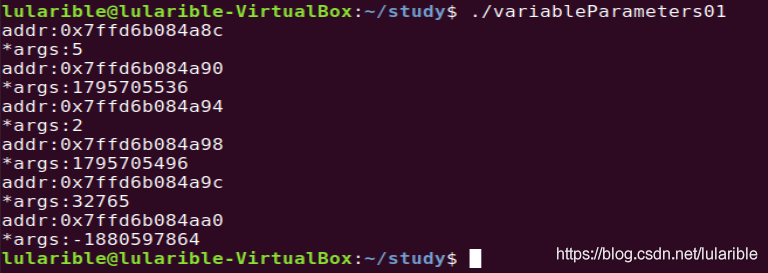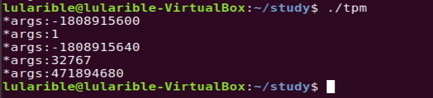 可以看到,不仅"int"型指针是8字节大小,"char"、"double"和结构体指针也都是8字节大小。这是因为笔者电脑安装的是64位系统。所以书上代码的"int"型指针自增操作不适用于笔者,笔者将其改为“args += 2”,在dev c++这个IDE中可以得到正确的结果,但在ubuntu gcc下还是不对。