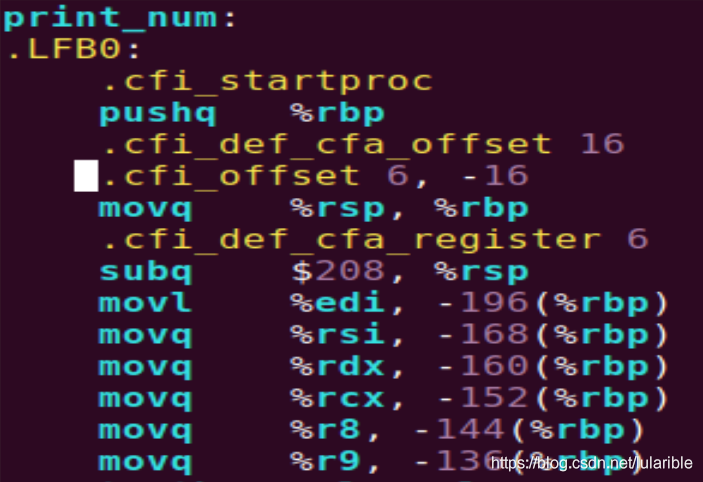 在main函数中,各个参数被放入不同的寄存器,在print_num函数中,又从寄存器中将参数取出来放入print_num的函数堆栈中。仔细看各个参数最终被放入的堆栈位置,发现第一个参数地址和第二个参数地址差了28个字节,而后面的参数地址之间都是差8个字节。这也就解释了为何之前的代码结果不对了。