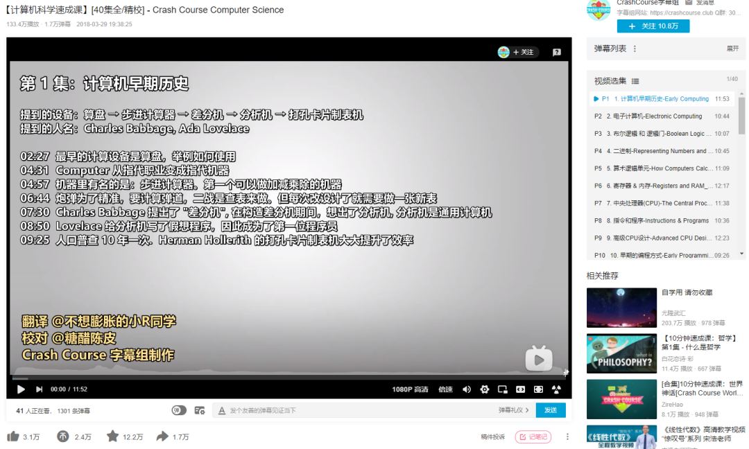 计算机科学速成课,内容覆盖面非常广,从底层的布尔逻辑,硬件原理,到黑客技术,再到热门的CV、NLP,言简意赅,覆盖面非常广,还能练习英语。