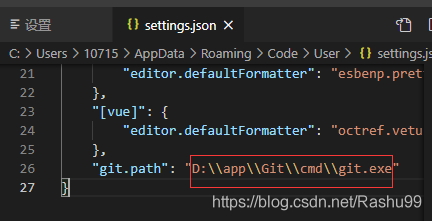 2.next完后,打开vscode,文件->首选项->设置->用户配置下加上git安装路径下的Git文件夹下的cmd的git.exe