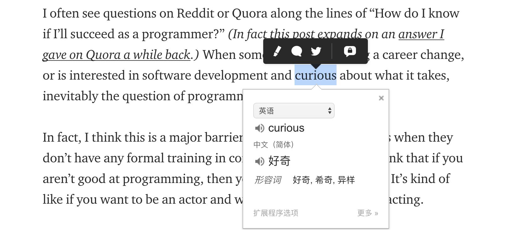 即使有了 Google 翻译,我劝大家手下留情,不要遇到英文原文就先翻译,应该尝试自己忍着读,遇到不会的单词双击看一下语义,按照自己的逻辑看完后再通篇翻译,这样做的好处就是英语功底会潜移默化地增强。