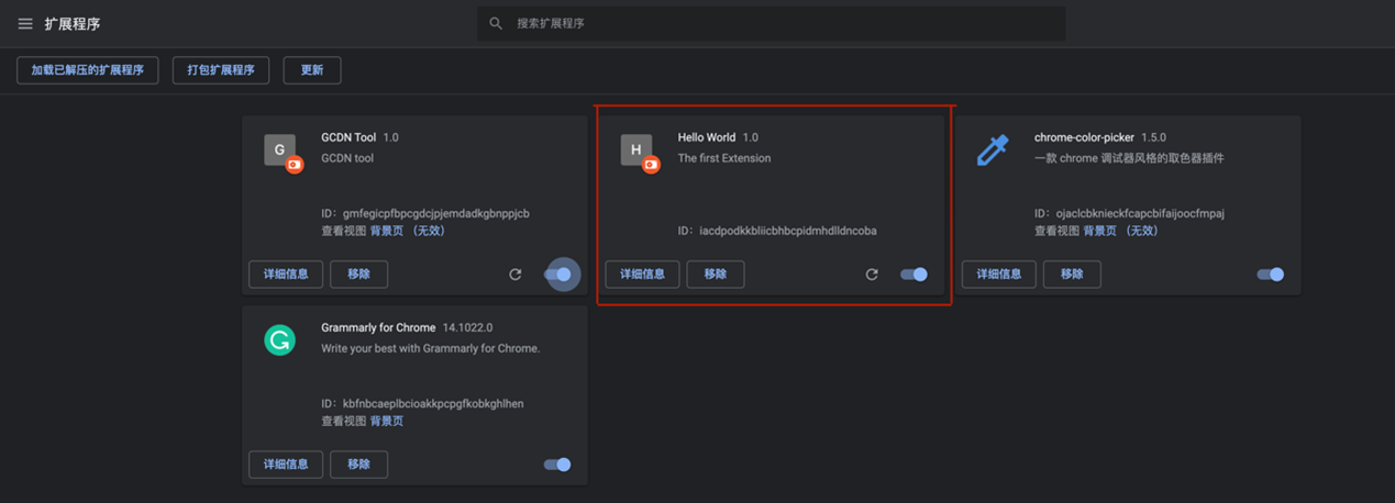 4、 完成之后,我们将带有hello.json、hello.png、manifest.json的文件夹加载到浏览器中