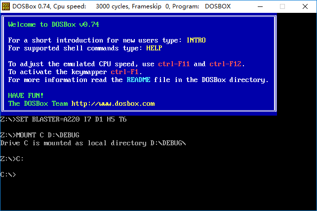 MOUNT C D:DEBUG # 将目录D:DEBUG挂载为DOSBOX下的C: C: