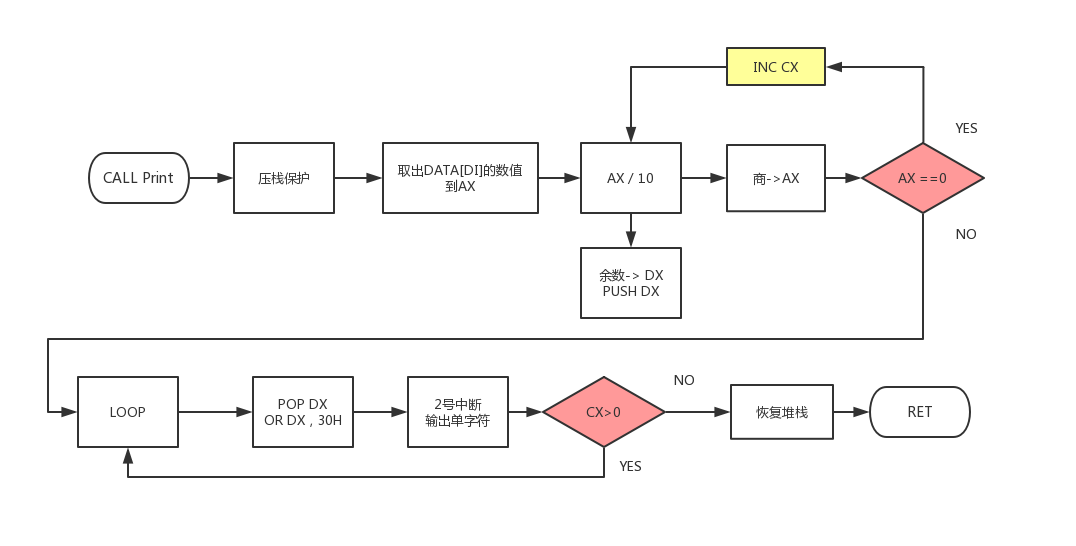 - 利用DIV函数的特点——每次除10的商放在AX, 余数放入DX