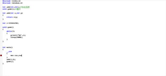 我们先写一句汇编代码,mov eax,eax其实这句代码并没有什么用,也就是将eax的值移入eax中,这句代码对于我们的作用仅作为断点,我们F5运行下程序并且切换到反编译界面