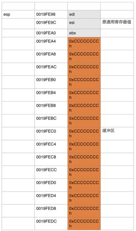 接着向栈中推入了ebx,esi,edi,栈顶指针[esp-Ch],然后lea指令将[ebp-40h]的地址放入edi中,给ecx赋值为10h=16,也就是循环16次又将0xCCCCCCCCh赋给eax,这也被称为断点字符,然后使用rep指令将缓冲区中的值赋值为0xCCCCCCCCh,现在我们再来看看堆栈中的变化