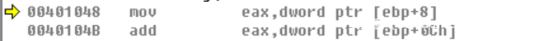 这里可以看到首先是将栈中的[ebp+8]=0019FEE4+8=0019FEEC地址中的值移动到eax中,然后将eax与[ebp+Ch]=0019FEE4+Ch=0019FEF0地址中的值相加,并且将相加后的值存入eax中,栈空间无任何变化,变化的仅仅是eax,咱们单步执行看下