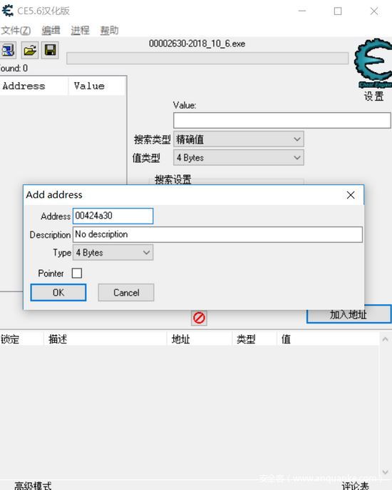 选择我们刚才运行的程序,点击加入地址,我们将00424a30这个内存地址加入进去