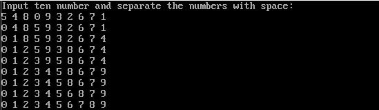 S0 SEGMENT STACK DW 20 DUP(?) TOP LABEL WORD S0 ENDS S1 SEGMENT TIP DB "Input ten number and separate the numbers with space:", 0DH, 0AH, 24H ARY DW 20 DUP(0) CRLF DB 0DH, 0AH, 24H N DW 0 S1 ENDS S2 SEGMENT ASSUME SS:S0, DS:S1, CS:S2, ES:S1 P PROC FAR MOV AX, S0 MOV SS, AX LEA SP, TOP MOV AX, S1 MOV DS, AX MOV AX, S1 MOV ES, AX LEA DX, TIP MOV AH, 9 INT 21H LEA SI, ARY XOR DX, DX MOV BL, 10 MOV CX, 10 INPUT: MOV AH, 1 INT 21H CMP AL, 20H ;空格分隔字符 JE SAVE ;输入十进制数,将数存入SI对应的内存单元 MOV DL, AL MOV AX, [SI] MUL BL SUB DL, 30H ADD AL, DL MOV [SI], AX JMP INPUT SAVE: ADD SI, 2 LOOP INPUT ;数组保存完毕 LEA SI, ARY MOV DI, SI ADD DI, 2 ;DI位于数组的第二元素的位置 MOV BP, 9 ;SI移动的次数和每一次比较的次数,第一次为9 GO: MOV CX, BP ;每一次比较的循环次数 MOV BX, [SI] ;第一个数 CMPA: CMP BX, [DI] ;比较后面的数是否比当前的小 JBE CON ;大于就比较下一个 MOV BX, [DI] ;将寄存器中的值替换为最小的值 MOV AX, DI ;AX存放最小值的偏移地址 CON: ADD DI, 2 LOOP CMPA CMP AX, 0 ;如果AX为0,则表示后面的值没有比当前值小 JE NO ;此时SI加一,移动到第二个数 下一次循环比较开始 CHANGE: MOV DX, [SI] ;78-83行替换当前值与最小值 PUSH DX MOV [SI], BX POP DX MOV DI, AX MOV [DI], DX NO: ADD SI, 2 MOV DI, SI ADD DI, 2 CALL PRINT DEC BP ;循环的次数减一 XOR AX, AX ;清除AX的内容,以便76行判断 CMP BP, 1 JNE GO EXIT: MOV AH, 4CH INT 21H P ENDP PRINT PROC NEAR PUSH SI PUSH CX PUSH AX PUSH DX LEA DX, CRLF MOV AH, 9 INT 21H LEA SI, ARY MOV CX, 10 L1: MOV AX, [SI] MOV N, AX CALL OUTPUT ADD SI, 2 MOV DX, 20H MOV AH, 2 INT 21H LOOP L1 POP DX POP AX POP CX POP SI RET PRINT ENDP OUTPUT PROC NEAR PUSH AX PUSH BX PUSH CX PUSH DX XOR CX, CX MOV AX, N MOV BX, 10 L2: XOR DX, DX DIV BX PUSH DX INC CX CMP AX, 0 JNE L2 L3: POP DX ADD DX, 30H MOV AH, 2 INT 21H LOOP L3 POP DX POP CX POP BX POP AX RET OUTPUT ENDP S2 ENDS END P