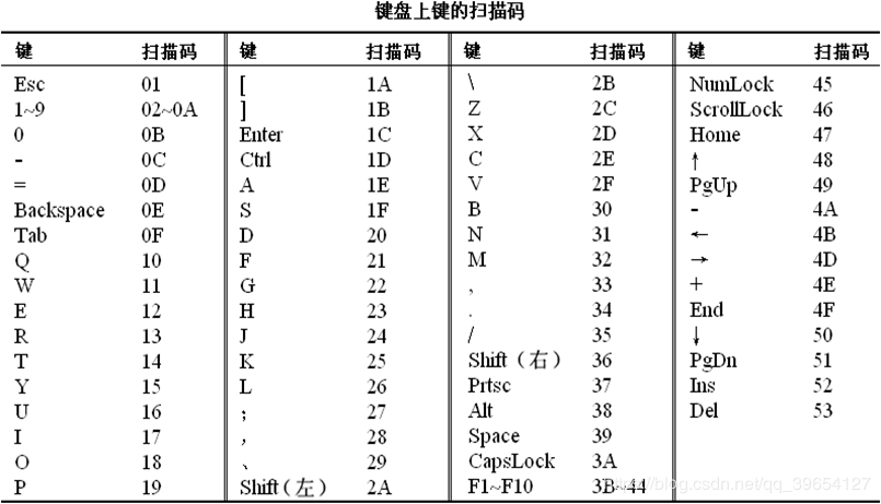 扫描码长度为一个字节,通码的第7位为0,断码的第7位为1