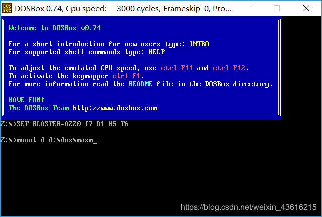 从上图我们可以看出此时的盘符是Z(为虚拟磁盘),下面我们要使用mount命令更改DOSBox的映射指向(注意masm是文件夹的名字,也就是你输入你创建的保存各种.exe文件的哪个文件夹的名称)。