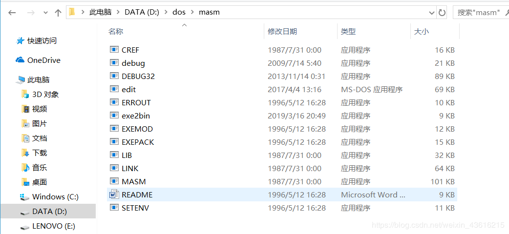 将这些文件剪切到一个新的文件夹里,作为以后的工作目录,我这里将它命名为dos,同时我在dos里又新建了两个子目录asm和masn,asm用于存放以后要编辑的代码,masm就是用于存放上面的各种.exe文件了。