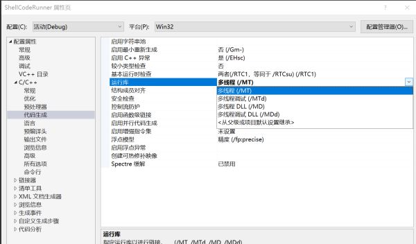 1.设置c运行库的静态编译,如图设置,将运行库设置为多线程/MT