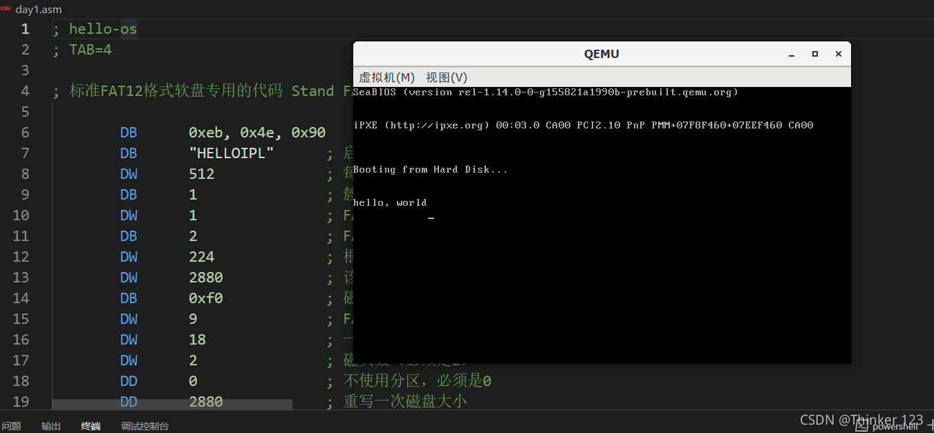 需要注意的是汇编代码必须加前面那个fat代码,不然bochs无法调试,还有另一种方法是用FixVhdw,这个方法可以去参考B站UP谭玉刚的视频。这个软件是X86汇编 从实模式到保护模式的作者写的。
