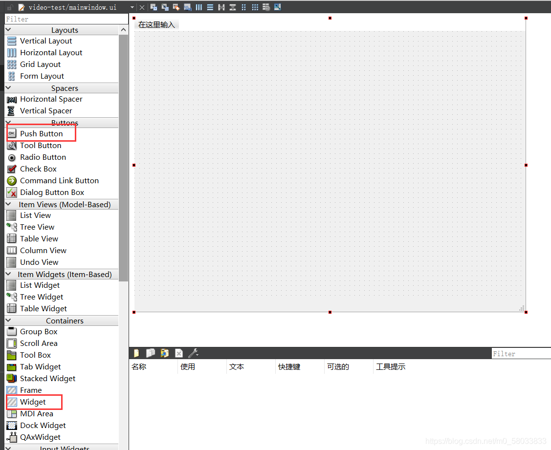 上面的框是Widget 这个控件拖进来后基本为透明状 仅有边框轮廓 我们改名为widget_video