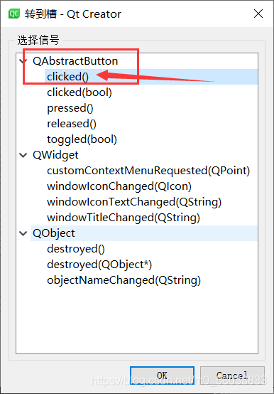 选择clicked()并点击下方OK按钮