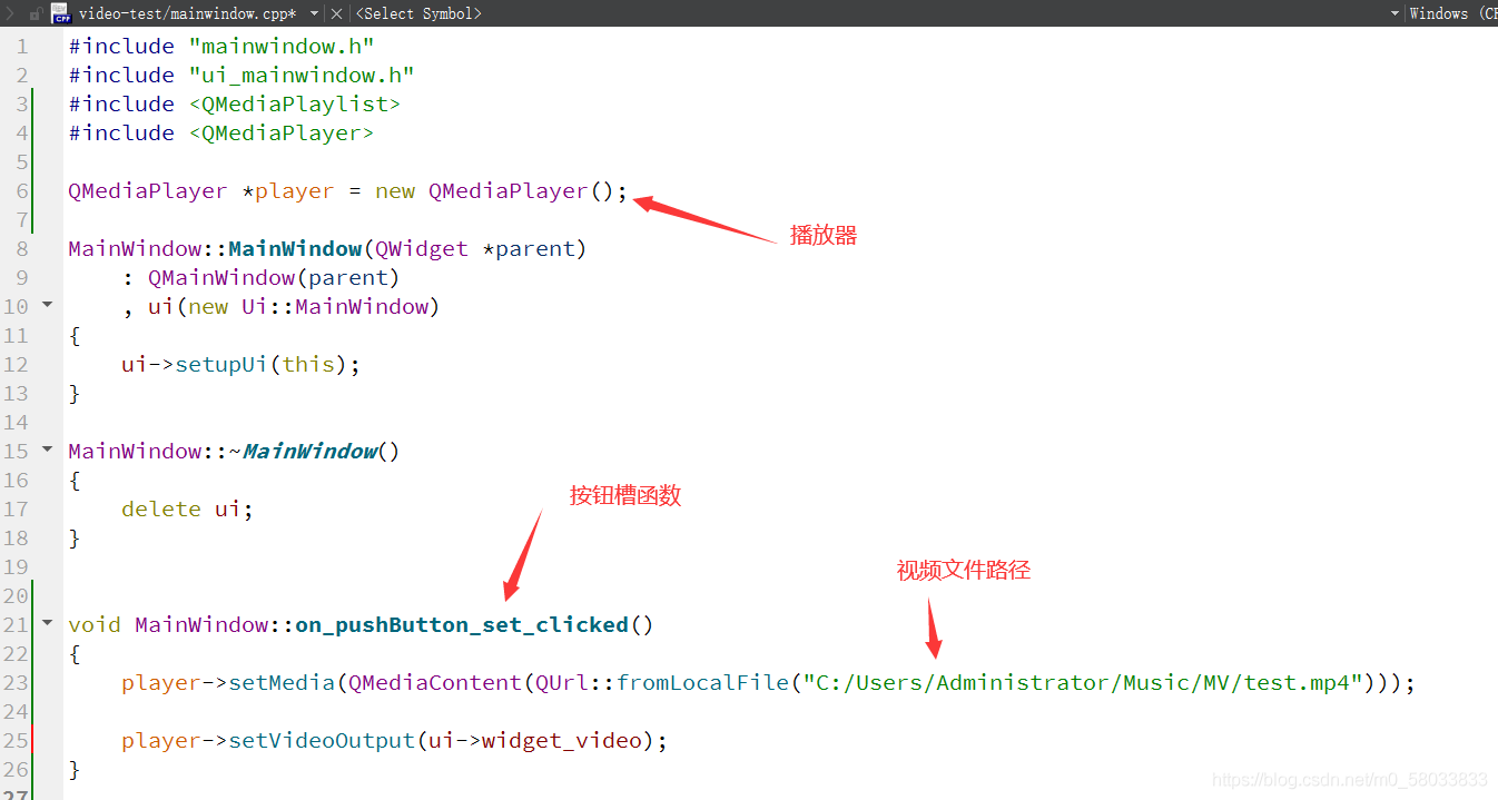 player->setMedia(QMediaContent(QUrl::fromLocalFile("C:/Users/Administrator/Music/MV/test.mp4")));
