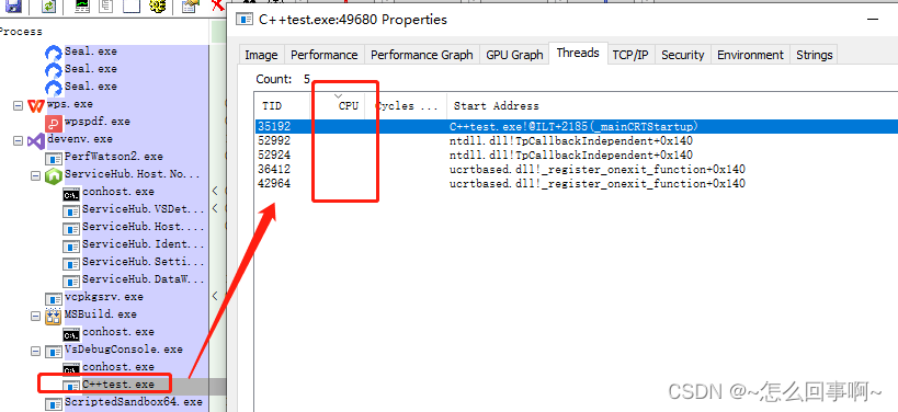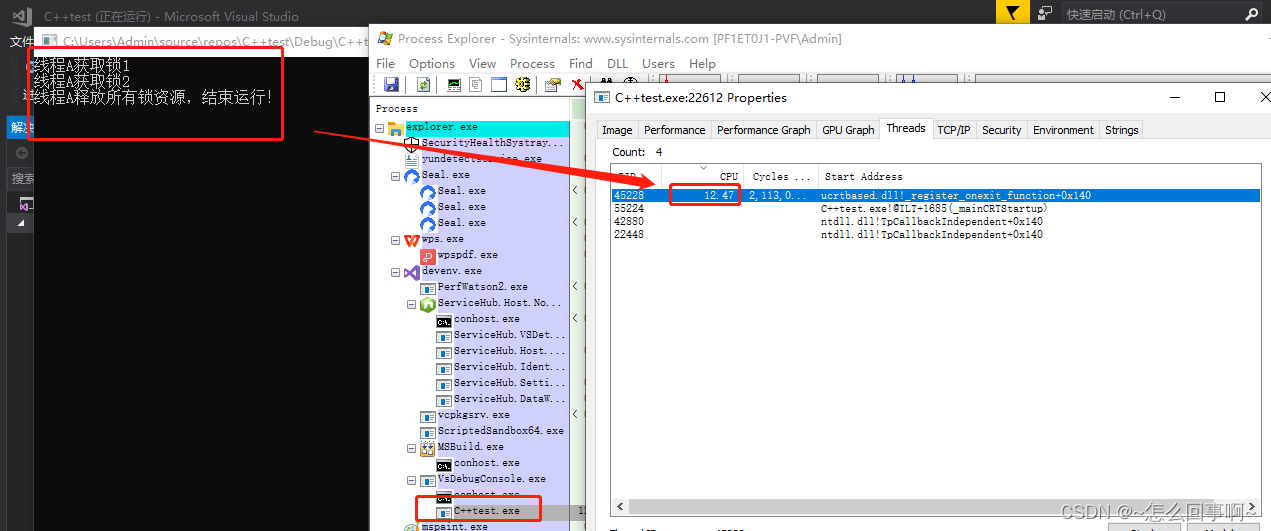 打开process Explorer.找到该进程,查看线程状态,发现线程的cpu利用率为0,那么应该不是死循环,应该是死锁了: