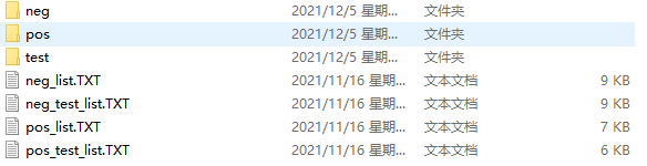 1)首先对所有图像进行预处理,假定将有烟当作正样本,将没烟看作负样本,train集的smoke文件夹改名为pos,train集的non文件夹改名为neg;同理将test集的smoke文件夹改名为pos,test集的non文件夹改名为neg。为了对所有图片进行处理,将train和test中的pos和neg中的图片全部规范命名格式为0001.jpg、0002.jpg、0003.jpg、0004.jpg、0005.jpg......。将这些图片名字提取出来分别存到“pos_list.txt、neg_list.txt、pos_test_list.txt、neg_test_list.txt文本中。如下图2-1图2-2所示