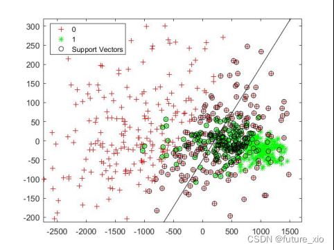 5)利用对训练集降维后得到的二维特征训练SVM二分类模型,
