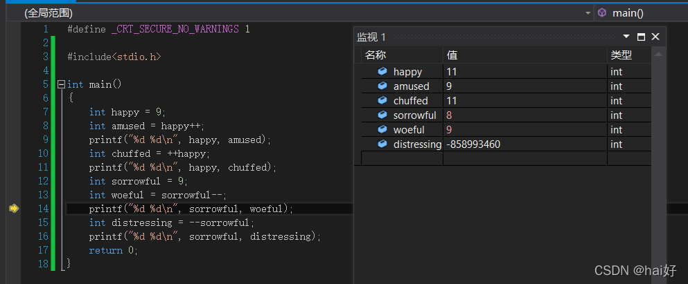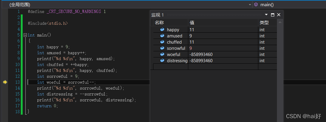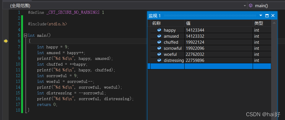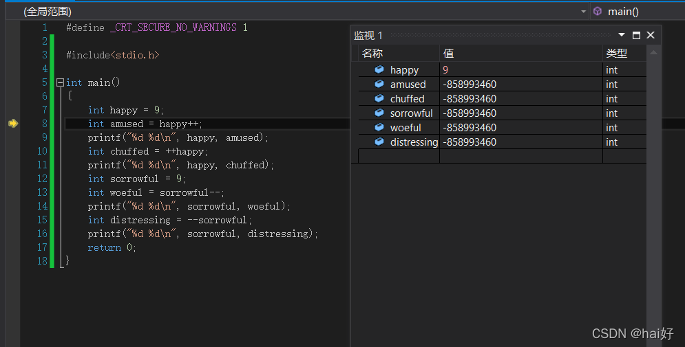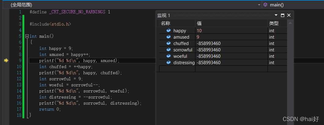 3、运算结束以后,由于是后置++的缘故,也就是先进行赋值运算以后再进行++操作,所以此时的happy变量变成了10