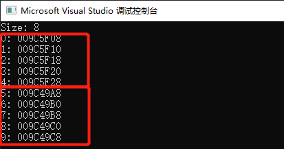 在上面的代码中设置一个内存池为5个内存块,当我们进行100次内存申请后,打印出前10个地址查看,可以看到前5个地址是连续的,后5个也是连续的,但中间由于重新申请了内存池,所以不是连续的。