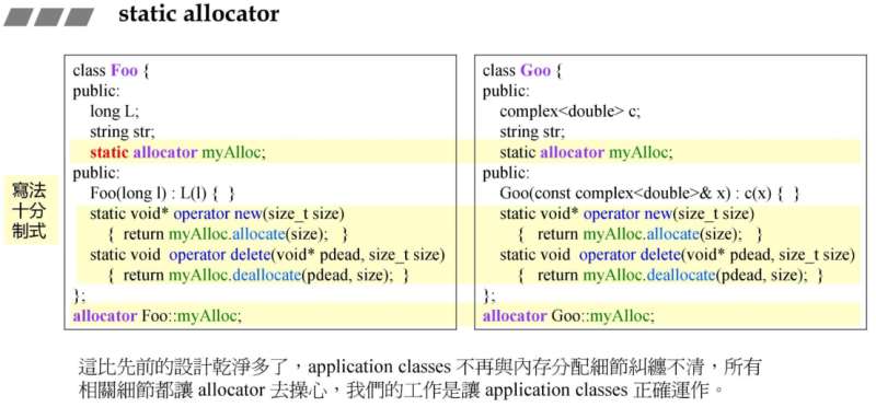 如此一来,我们的 class 只需要去调用 allocator 即可完成内存的申请和释放工作。