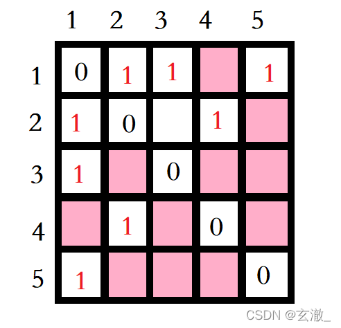1表示有边,x表示没有边,0表示顶点自己到自己。