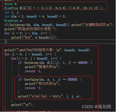 //A为n维数组,e为元素变量,随后是n个下标值 //若下标不超界,则将e赋值为所指定的A的元素(获取) Status GetValue(ElemType* e, Array A, ...);