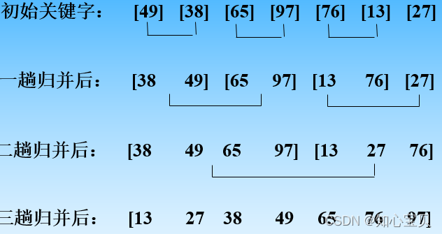 将一串序列,相邻的两个归并到一起排序,再次把相邻两个有序的归并块再次排序,直到最后有序(优先推荐这种算法)