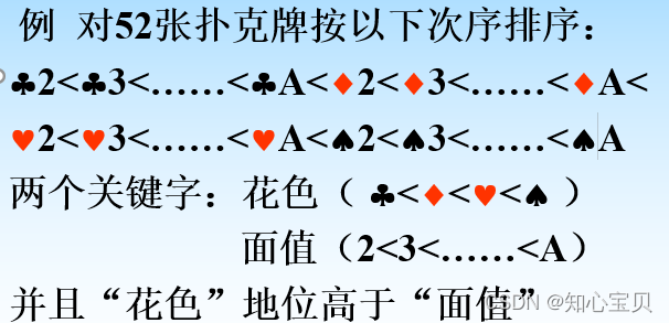 低位优先:按照面值大小分成13类,将相同面值的不同花色进行排序