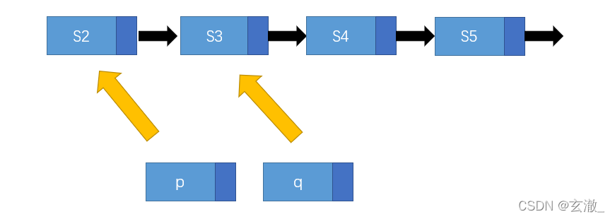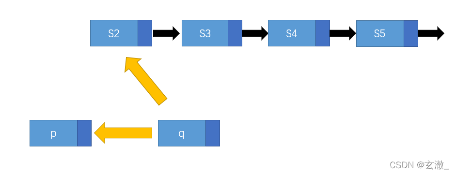 - 循环将下一个结点赋值给q,释放p,将q赋值给p