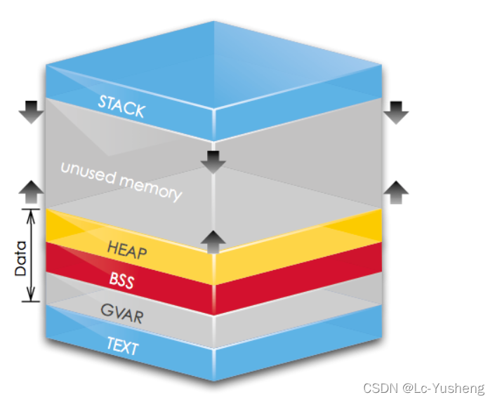 Heap: 堆,自由申请的空间,按内存地址由低到高方向生长,其大小由系统内存/虚拟内存上限决定,速度较慢,但自由性大,可用空间大。