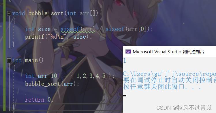 void bubble_sort(int arr[]) void bubble_sort(int* arr)当数组在传参之后,函数部分是不能计算数组的元素个数的。因为形参接收的只是一个数组的首元素地址的指针,而不是整个数组,计算数组的时候也只是计算了数组的首元素地址的大小,然后再除以首元素地址的大小,所以理所当然的得到一个1。所以,当数组需要传参,并且还需要用到数组的元素个数时,要先计算好数组元素个数,将计算好的元素个数和数组一起传参。