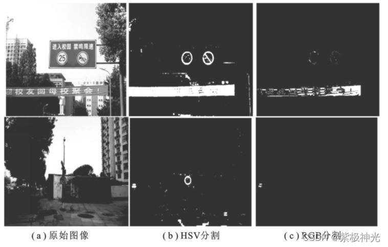 通过对比实验可见, 基于RGB空间的颜色分割在影像光照条件不足的情况下难以将标志牌分割出来, 而HSV空间对光线要求较低, 可以较好地识别红色区域, 所以文中采用HSV空间的颜色分割优于其他文献提出的RGB颜色分割效果。