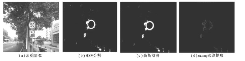 交通标志的自动识别首先需要对标志牌进行准确定位.为了解决复杂环境背景下的限速标志牌定位问题, 通过查阅《道路交通标志和标线》中对限速标志牌制作的规定, 按照规定限速标志牌外围均呈红色, 利用这一特征首先对原始影像进行颜色分割, 将红色区域分割出来, 排除一些不必要的噪声, 接着对影像进行滤波;然后进行边缘提取, 椭圆拟合;最终将圆形标志检测出来.