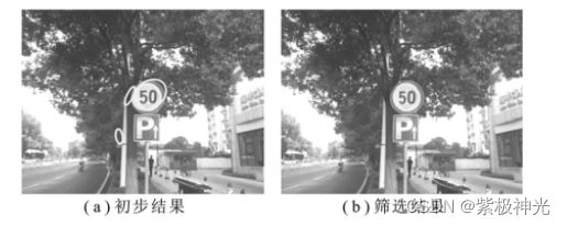 文中利用最小二乘法对椭圆进行拟合, 由于道路背景较为复杂, 初步拟合的椭圆含有较多干扰信息 (如图3 (a) 所示) , 因此, 对拟合出的椭圆扁率进行限制, 若扁率e介于0.8~1.2之间, 即0.8≤e≤1.2时, 则认为是圆形交通标志牌区域;否则, 为干扰信息.其最终检测结果如图3 (b) 所示.