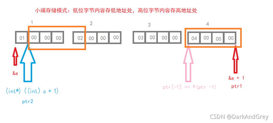 // 再将他转换为一个地址,在对其解引用 ,此时它(ptr2)指向 01 的后面,又因为ptr2是int 类型
