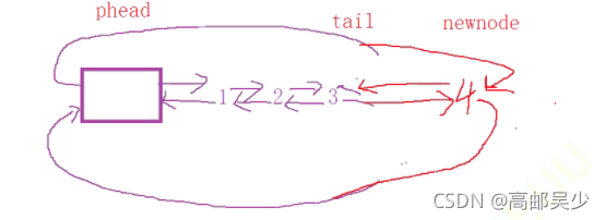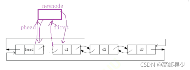 head的后驱指向newnode,newnode的前驱和后驱分别指向phead和d1,d1前驱指向newnode如下图: