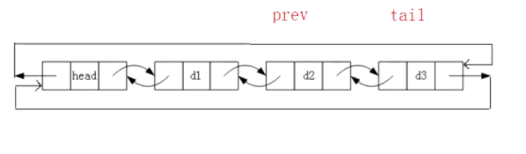 现在要删除d3这个节点,我们定义一个tail和prev指针分别指向d3和d2,然后把d2后驱接上head,head前驱接上d2即可,如下图: